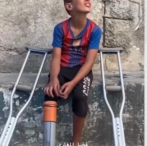 في خيمة مهترئة بدير البلح وسط قطاع غزة، يقف الطفل الفلسطيني راتب اقليق (9 سنوات) مستندا إلى أنبوب بلاستيكي ابتكره ليحل محل ساقه المبتورة، ويحاول خطو أولى خطواته وسط الخراب والألم.