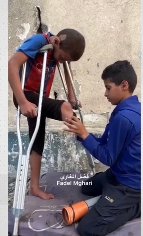 ومع ذلك، استطاع راتب أن يواصل خطواته الأولى بمساعدة الأنبوب البلاستيكي الذي صنعه برفقة صديقه ليتمكن من المشي وسط الخراب والألم في ظل واقع قاس فرضته حرب الإبادة المستمرة منذ نحو عامين.